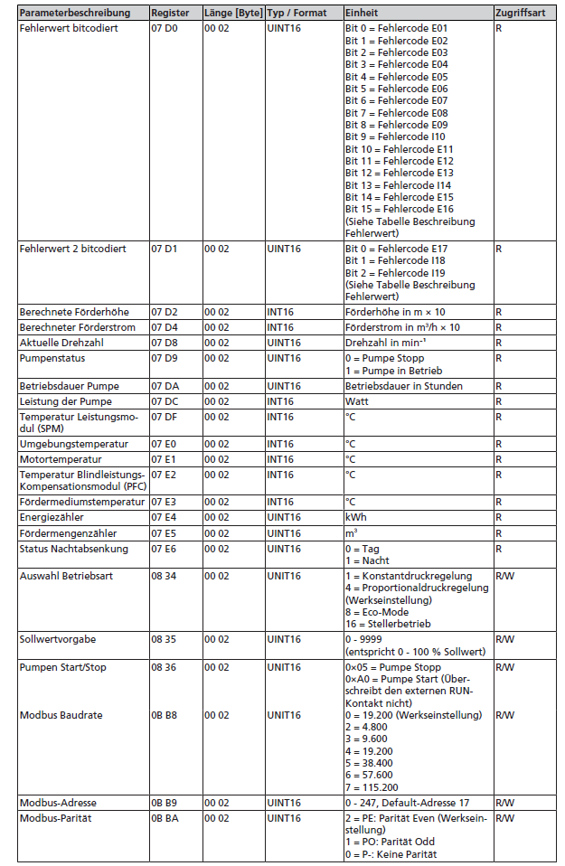 Über Modbus kann auch die Betriebsart der Pumpe umgeschaltet werden (siehe Tabelle).