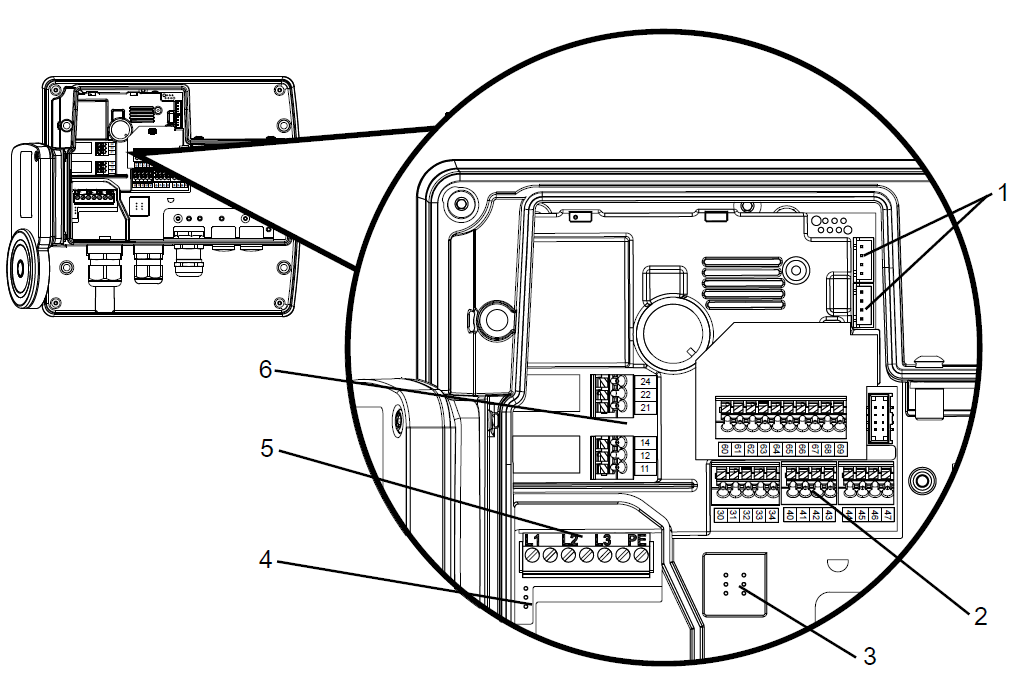 | 1 | Steckplätze Zubehörsatz M12-Kit für Doppelpumpenbetrieb | 2 | Klemmen I/O-Anschlüsse |