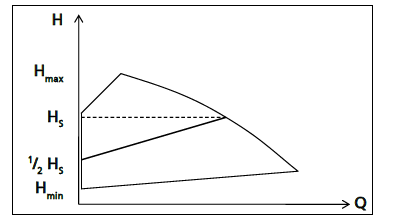 Abhängig vom Förderstrom verringert oder erhöht die Proportionaldruckregelung den Förderhöhensollwert linear über dem zulässigen Förderstrombereich zwischen 1/2 HS und HS (Werkseinstellung).