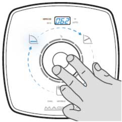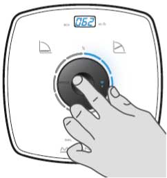 | Schritt 4 b: Neue Sollwerteinstellung vornehmen ▪ Einstellrad drehen und gewünschten Sollwert in 1 % Schritten im Bereich 0 % bis 100 % einstellen. – Drehen im Uhrzeigersinn erhöht den Sollwert, Drehen gegen den Uhrzeigersinn verringert den Sollwert. – Jedes LED-Segment leuchtet in 10 % Schritten. ▪ Bedienknopf drücken und gewünschten Sollwert speichern. |