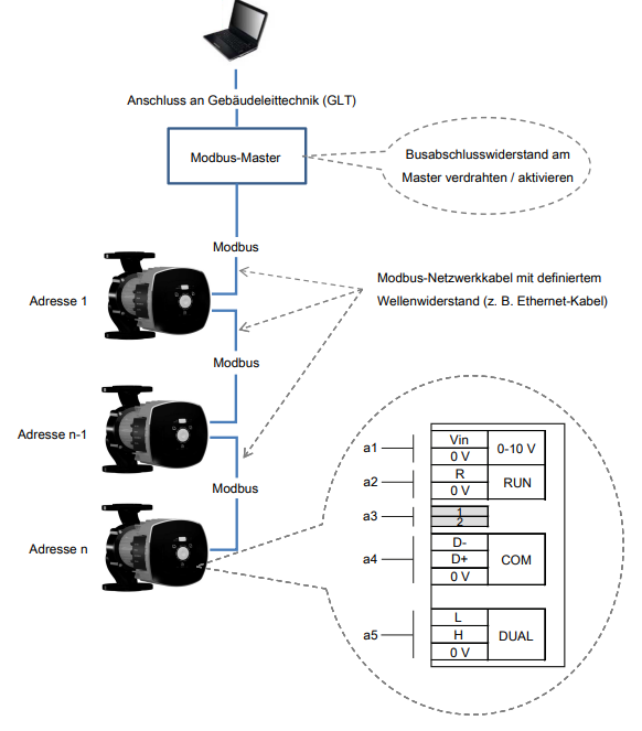 Alle Pumpenaggregate an einen Modbus-Master anschließen. Der Modbus-Master steuert die Buskommunikation an und sendet Telegramme an die angeschlossenen Pumpenaggregate. Alle Pumpenaggregate sind Slaves, die nur nach Ansprache des Modbus-Masters antworten. Die Pumpenaggregate senden selbsttätig keine Telegramme. Jedes Pumpenaggregat erhält bei der Inbetriebnahme eine eigene, eindeutige Adresse.