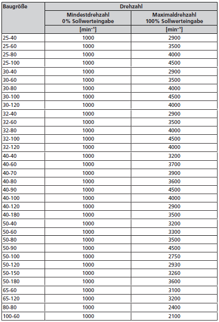 Tabelle: Mindestdrehzahl und Maximaldrehzahl pro Baugröße