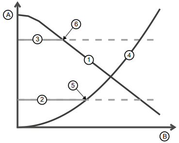 Die Schaltparabel (4) stellt die Kurve dar, bei der der Wirkungsgrad der Anlage von einem oder 2 laufenden Pumpenaggregate identisch ist. Links von der Parabel ist der Wirkungsgrad höher, wenn nur ein Pumpenaggregat fördert. Rechts von der Parabel ist der Wirkungsgrad höher, wenn 2 Pumpenaggregate fördern. Die Zuschaltung erfolgt anhand 2 Kriterien: Effizienz (Kriterium 1) und Förderhöhenbedarf (Kriterium 2).