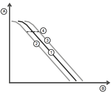 Befindet sich der Betriebspunkt sehr nah an Kurve ①, kann es durch Messrauschen zu Flattern führen. Flattern bedeutet ein permanentes Zuschalten und Abschalten innerhalb eines einstellbaren Zeitfensters (Menünummer 3-6-7-7). Zum Vermeiden des Flatterns erfolgt die Zuschaltung und Abschaltung durch Hysterese. Die obenstehenden Abbildungen zeigen die Zuschaltung und Abschaltung durch Hysterese nach Kriterium 1 und Kriterium 2.