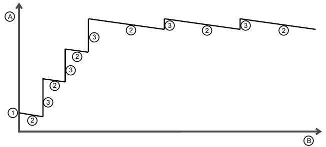 Eine zu hohe Hysterese führt zu erhöhtem Energieverbrauch. Eine zu geringe Hysterese schützt nicht ausreichend vor Flattern. Die Steuerung verfügt über ein lernendes Verfahren mit dem sich die Hysterese automatisch optimiert. Nach der Erstinbetriebnahme nimmt die Hysterese ihren einstellbaren Startwert (Menünummer 3-6-7-3) ① ein. Wird ein Flattern erkannt, erhöht sich die Hysterese um einen einstellbaren Wert (Menünummer 3-6-7-6) ③. Ändert der Nutzer sein Verhalten mehrfach in kurzen Zyklen, interpretiert die Steuerung das fälschlicherweise als Flattern, wodurch sich die Hysterese erhöht. Zum Korrigieren solcher Fehlentscheidungen ist das Verfahren um die Funktion des Vergessens erweitert. Die Hysterese reduziert sich stetig mit konstanter Geschwindigkeit (Menünummer 3-6-7-2) ②, bis zum Erreichen einer einstellbaren minimalen Hysteresegrenze (Menünummer 3-6-7-4). Das Verfahren wird in der nachstehenden Abbildung erläutert:
