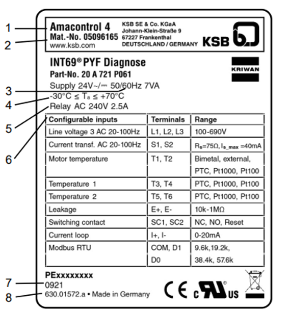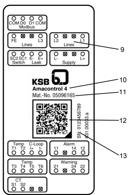 | 2 | KSB-Materialnummer | 9 | Erläuterung der Anschlussklemmen |
